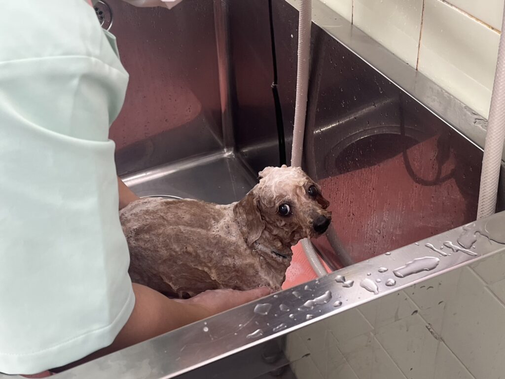 こちらのダックスちゃんはシャンプー後にドライヤーで乾かしてもらっていますが、少し眠たそう??