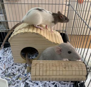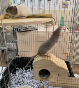 小屋の上に乗っているのがファンシーラットで手前にいるのが耳が少し下に付いているダンボと呼ばれるファンシーラットです🐭