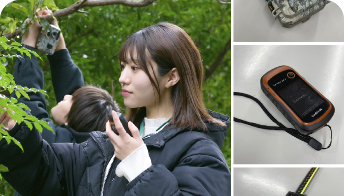 実際の野生生物調査の現場でも使用される機材を用いて実習に取り組み、実践を通じてその利用法を学んでいきます。