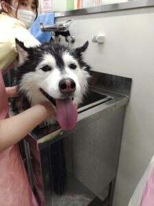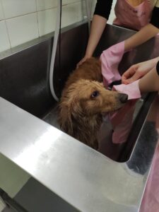 ミニチュアダックスのくっきーちゃんもきれいに洗ってもらっています。