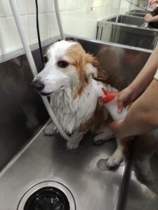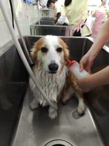 シャンプーの順番が回ってきてうれしそう。早くシャンプーしてっておねだりしているみたいです。