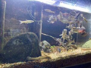 この子たちは実際に琵琶湖から来てくれた子たちです。できる限り、暮らしていた環境に近いように、水槽のレイアウトを考えたり、水槽の中の木の部分は学生が手作りで作成しました。