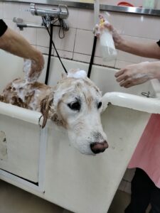 気持ちよさそうにシャンプーをしてもらっていました。