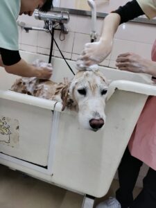 気持ちよさそうにシャンプーをしてもらっていました。