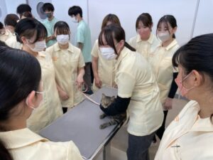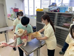 こちらでは、わんちゃんの前側の生徒は動いてしまわないよう保定を行い、後ろ側の生徒が、股動脈といわれる脈で、簡単な心拍数の測定をおこなっています。