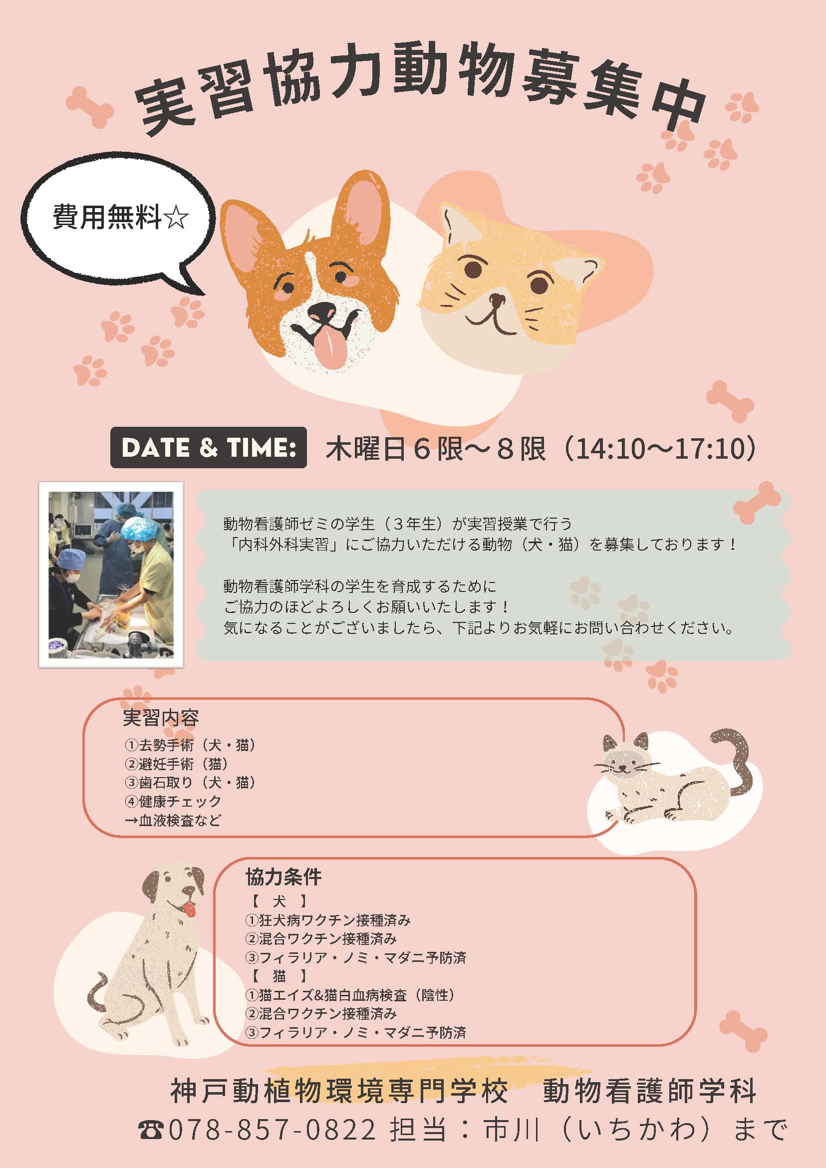 学生の実習授業にご協力いただけるワンちゃん・ネコちゃんを募集しています!