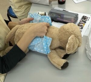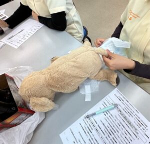 ほかにも、おむつやマナーベルトの付け方など、意外と飼い主さんも知らないことがあるので、看護師さんは教えれるように知っておかないといけず、そちらの練習も行います。