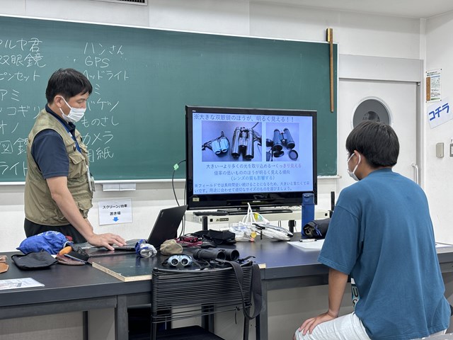 双眼鏡、フィールドノート、長靴など、調査現場で欠かせない道具を実際に手に取り、